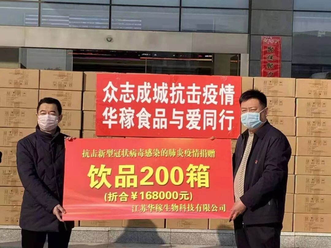 国家高新技术企业、江苏省农业科技型企业—华稼食品科技有限公司捐赠200箱价值人民币16.8万元的蛋白营养饮品,用于增强重点关爱对象的身体免疫力。