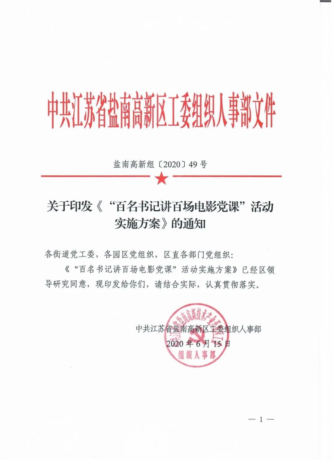 盐南高新区组织人事部创新党课教育形式,精选近百部优秀红色电影,编写近百篇电影党课案例教材,帮助全区各级基层党组织书记,通过主题宣讲加观看电影相结合的方式,在红色7月广泛开展书记讲电影党课活动。