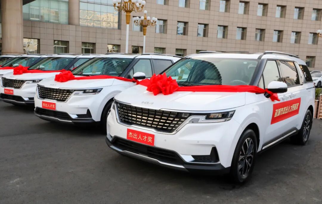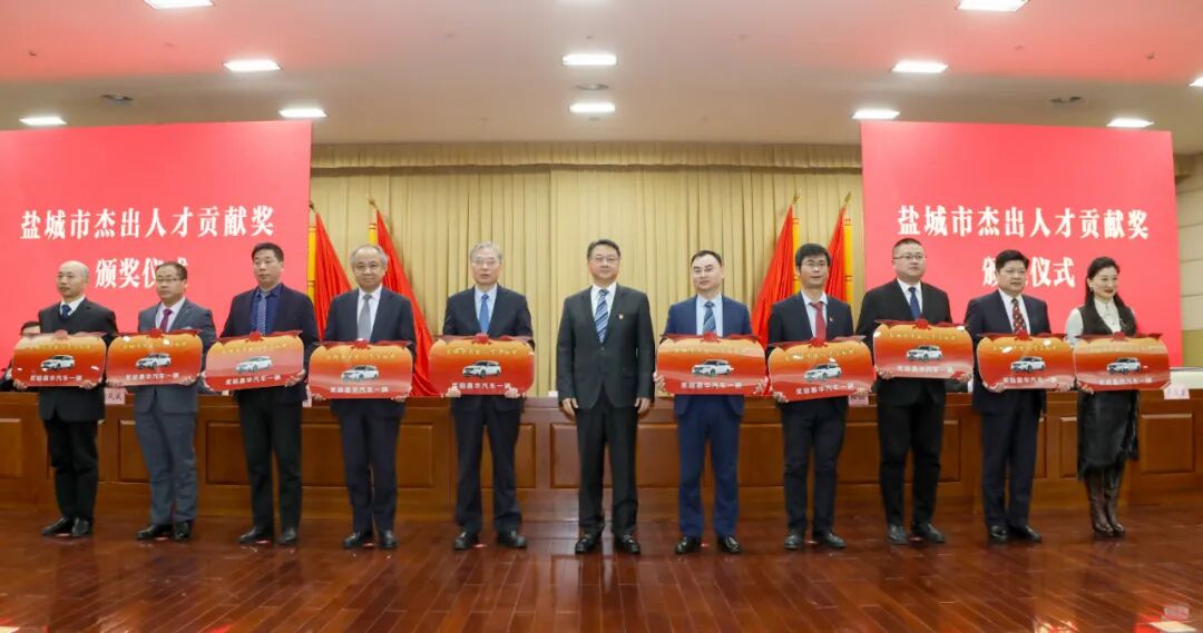 ▲“盐城市杰出人才贡献奖”的10位同志,每人奖励起亚嘉华汽车一辆