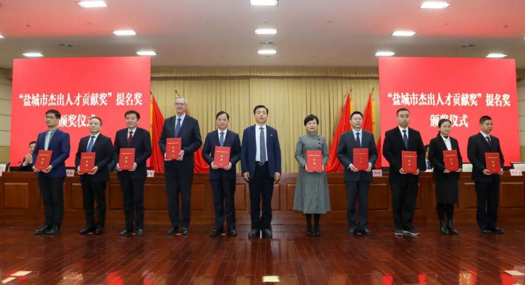 ▲为获得“盐城市杰出人才贡献奖”的同志颁奖