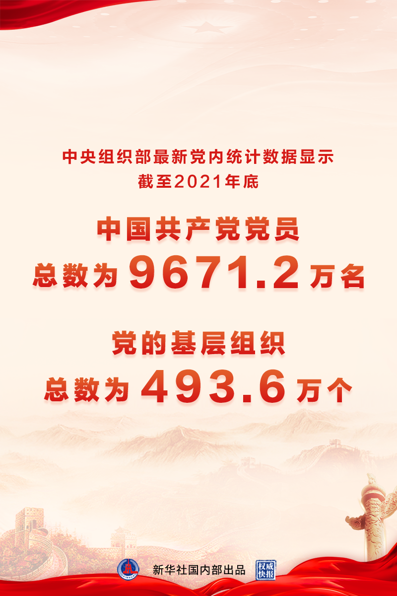 截至2021年12月31日,中国共产党党员总数为9671.2万名,比2020年底净增343.4万名,增幅为3.7%。