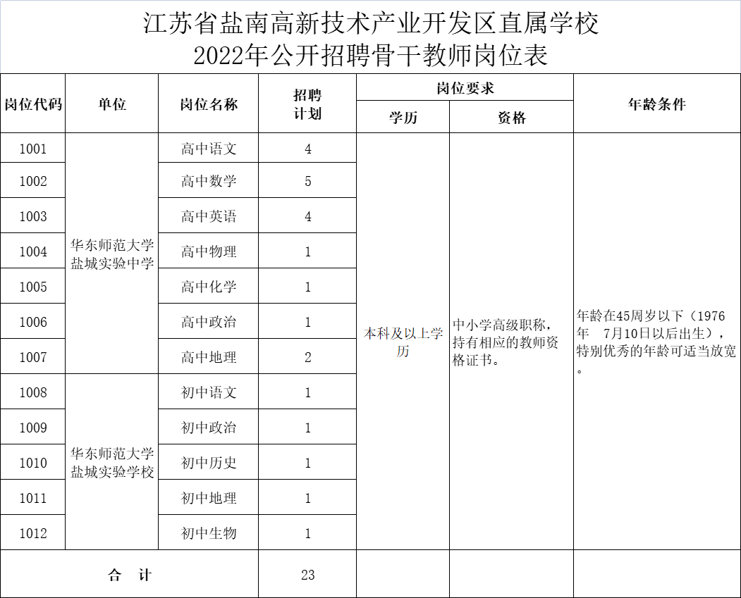 为适应教育事业发展需要,选拔优秀适岗人才,充实教师队伍,优化师资结构,根据《江苏省事业单位公开招聘人员办法》(苏办发〔2020〕9号)等文件精神,江苏省盐南高新技术产业开发区直属学校2022年公开招聘骨干教师23名。