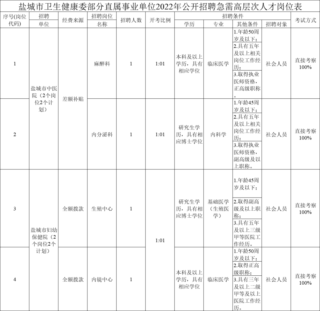 盐城市卫生健康委部分直属事业单位2022年公开招聘急需高层次人才公告