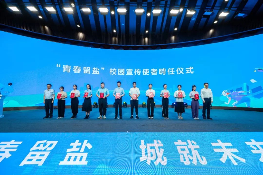 市委组织部部务会成员、市委人才工作领导小组办公室副主任倪一华,团市委副书记万强共同为第三批“青春留盐”校园宣传使者代表颁发聘书。