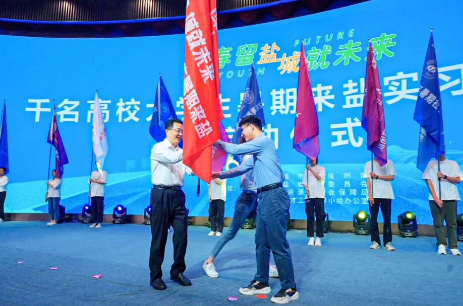 活动现场,费坚为“青春留盐 城就未来”千名高校大学生来盐实习实践活动授总旗。