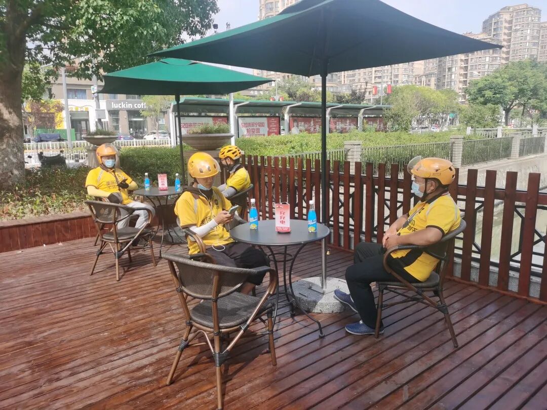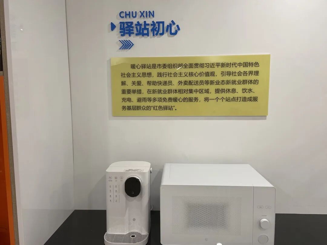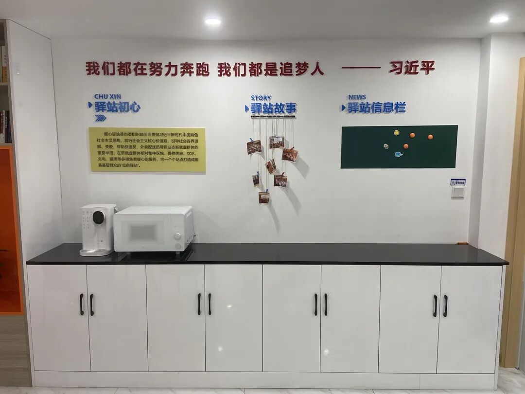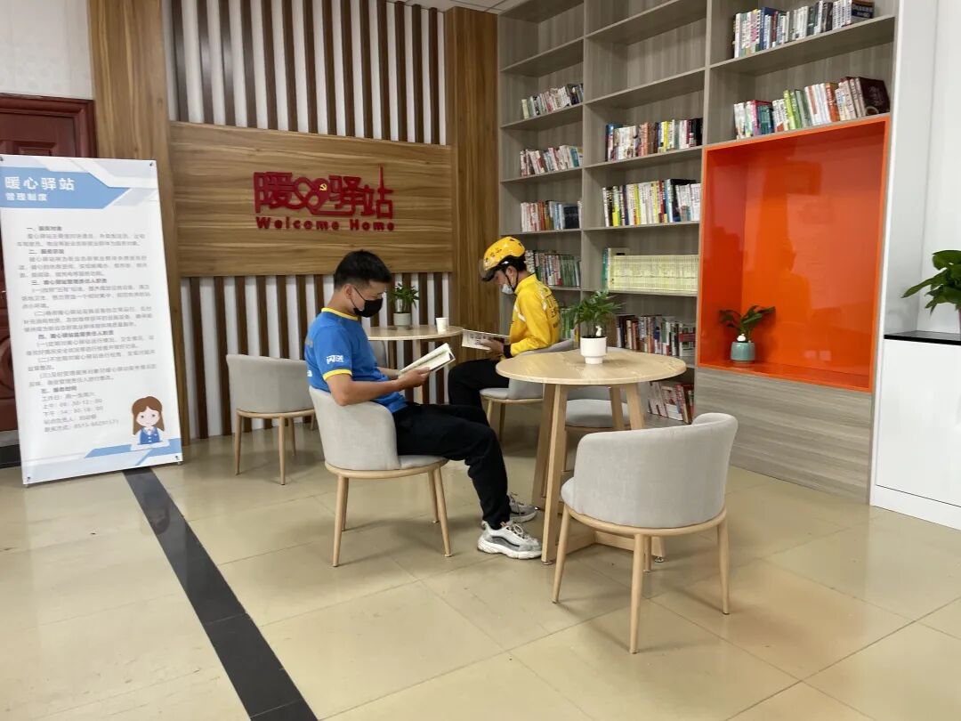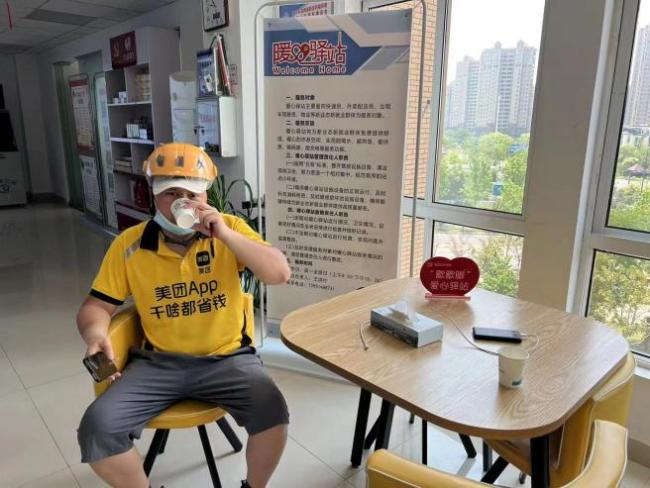 “八月以来,盐城持续高温最高达到40度,对我们小哥真是太难熬了。”一口气把两杯冷饮灌下肚的老吴笑着抱怨了一句之后,话头一转就夸起了这边的“暖心驿站”,“这里可真是不错,配有空调,热水凉茶都随到随取,冰箱可以放我们自带的中饭,微波炉还可以加热,应急药箱、手机充电口这些东西也都给我们准备好了,我们干活累了就来这里坐上一会,门口还有电瓶车充电桩,真是太用心了!”