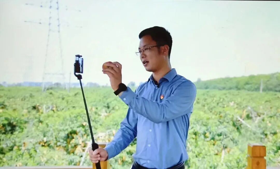 “大家看我手里的桃子,这是我们刚从果园里摘的,汁多果甜,有喜欢的朋友可以点击链接购买……”近日,建湖县芦沟镇东升村村书记孙朗桥在家里拿着支架,借助“新农具”,为东升村特色农产品乐此不疲地吆喝着。