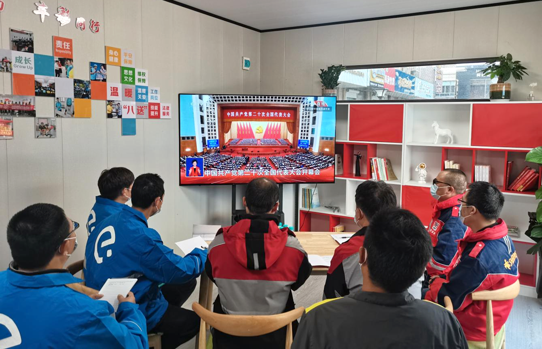 ▲大丰区在暖心驿站组织外卖与快递行业党员小哥集中学习收看党的二十大开幕会。