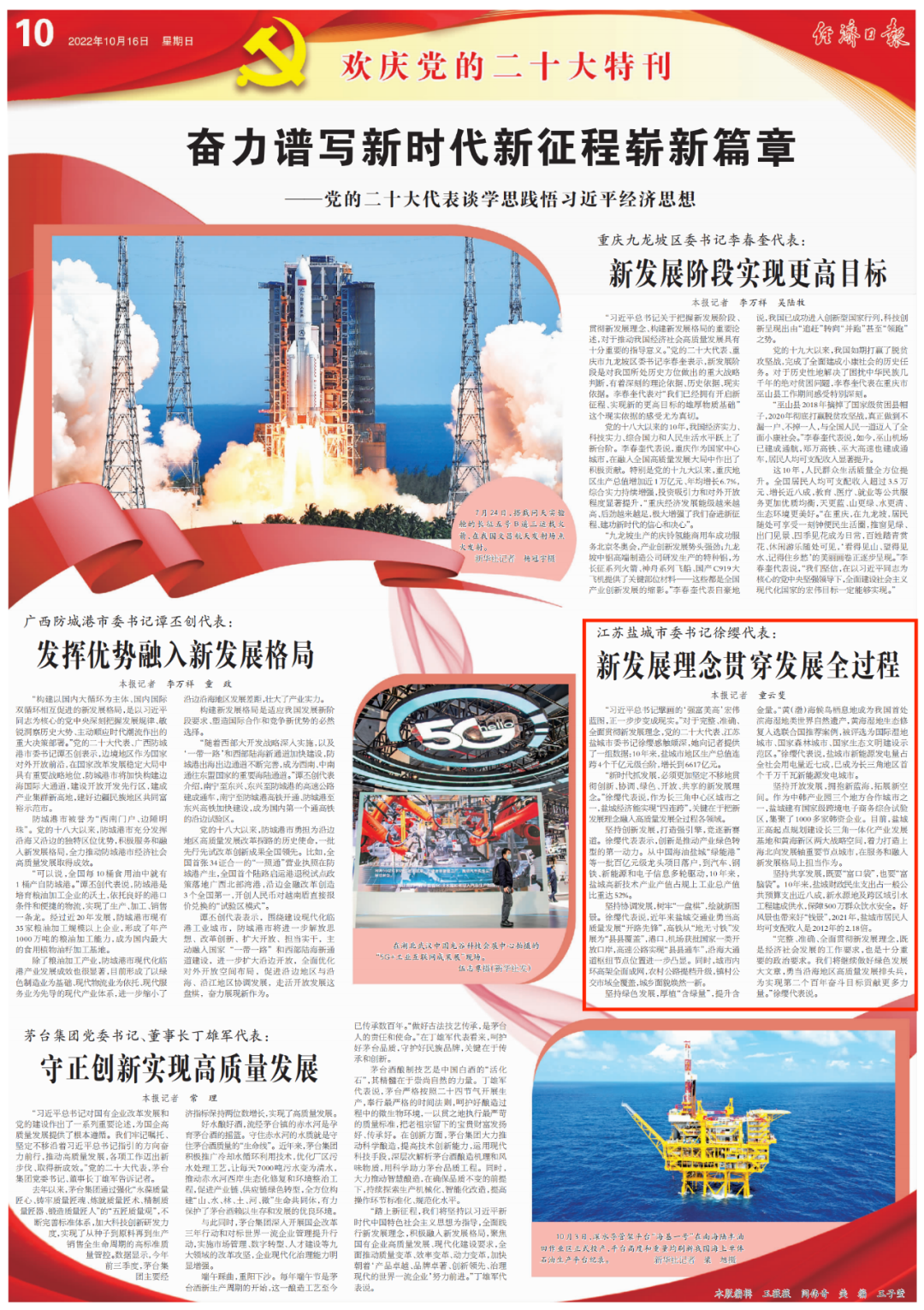 “习近平总书记擘画的‘强富美高’宏伟蓝图,正一步步变成现实。”对于完整、准确、全面贯彻新发展理念,党的二十大代表、江苏盐城市委书记徐缨感触颇深,她向记者提供了一组数据:10年来,盐城市地区生产总值连跨4个千亿元级台阶,增长到6617亿元。