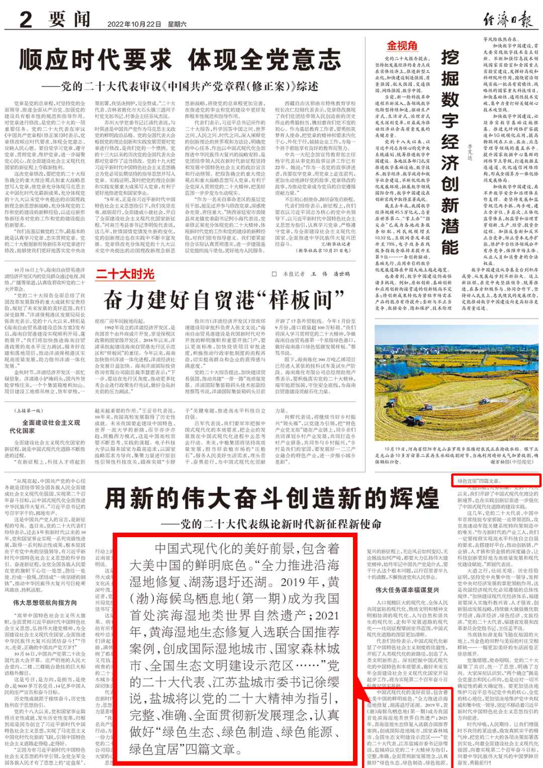 10月22日,《经济日报》刊文,《用新的伟大奋斗创造新的辉煌——党的二十大代表纵论新时代新征程新使命》这篇报道中徐缨代表围绕中国式现代化的美好前景,介绍盐城将认真做好“绿色生态、绿色制造、绿色能源、绿色宜居”四篇文章。