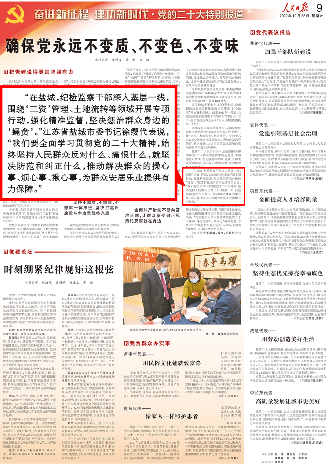 “在盐城,纪检监察干部深入基层一线,围绕‘三资’管理、土地流转等领域开展专项行动,强化精准监督,坚决惩治群众身边的‘蝇贪’。”江苏省盐城市委书记徐缨代表说,“我们要全面学习贯彻党的二十大精神,始终坚持人民群众反对什么、痛恨什么,就坚决防范和纠正什么,推动解决群众的操心事、烦心事、揪心事,为群众安居乐业提供有力保障。”