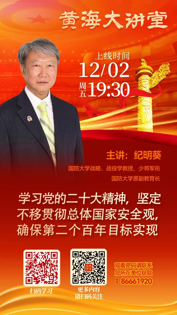 黄海大讲堂:学习党的二十大精神,坚定不移贯彻总体国家安全观,确保第二个百年目标实现 2022-12-02 10:01     来源:    作者:    浏览:6462次