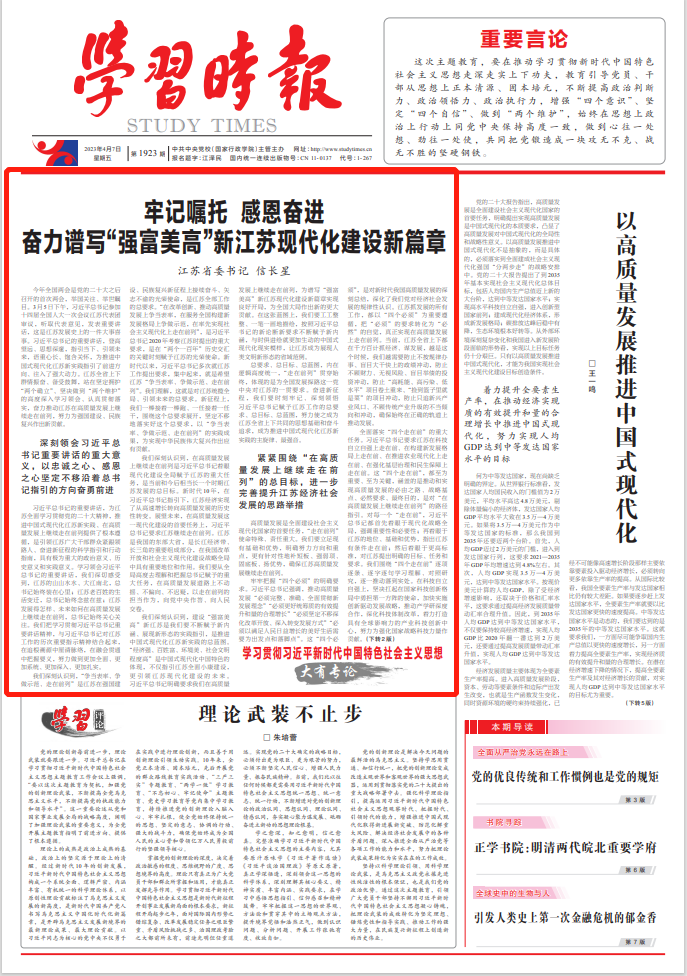 高质量发展是全面建设社会主义现代化国家的首要任务,“走在前列”使命特殊、责任重大。我们要立足现有基础和优势,明确努力方向和重点,更有针对性地补短板、强弱项、固底板、扬优势,确保江苏高质量发展继续走在前列。