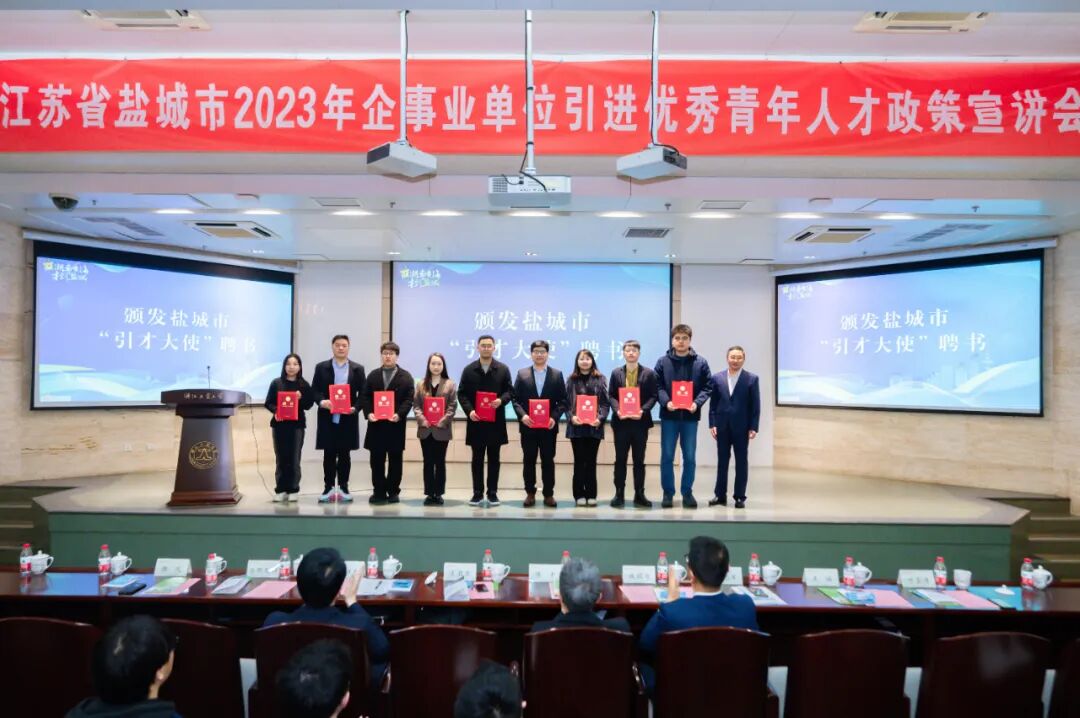 ▲图为颁发盐城市“引才大使”聘书