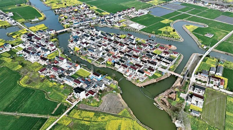 近年来,江苏省海安市南莫镇唐庄村积极探索“人居环境示范+产业发展+乡村振兴”的发展模式,推动传统村落保护利用高质量可持续发展。图为唐庄村鸟瞰图。 新华日报社供图 顾华夏/摄