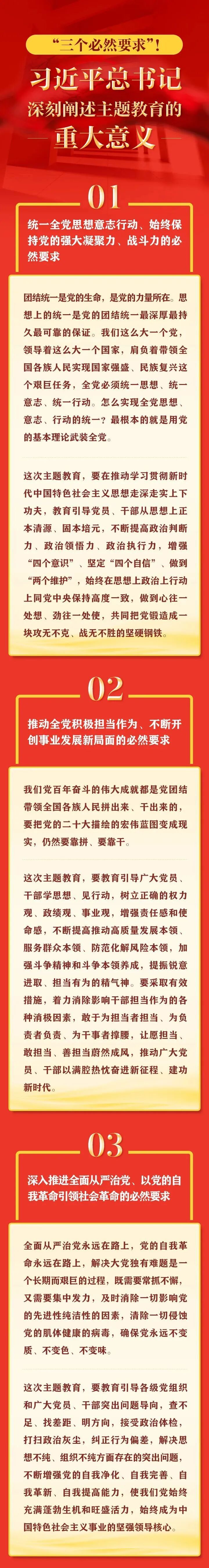 “以县处级以上领导干部为重点在全党深入开展学习贯彻新时代中国特色社会主义思想主题教育,是贯彻落实党的二十大精神的重大举措,对于统一全党思想、解决党内存在的突出问题、始终保持党同人民群众血肉联系、推动党和国家事业发展,具有重要意义。”