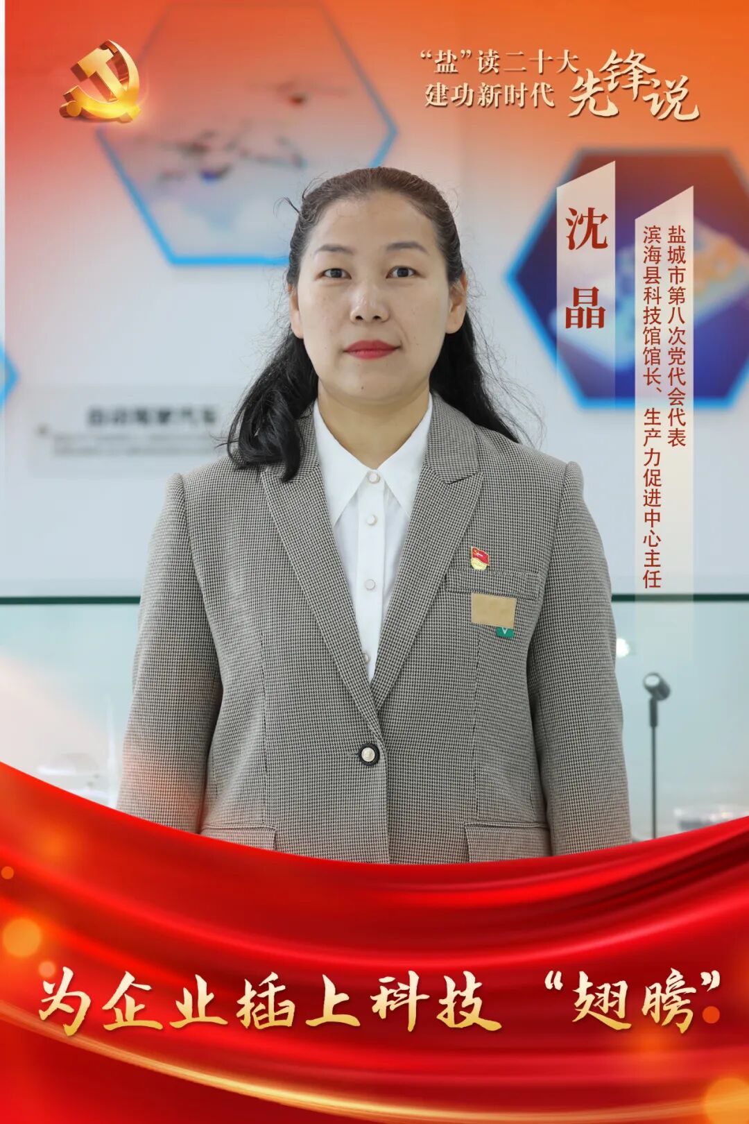 我叫沈晶,是滨海县科技馆馆长、滨海县生产力促进中心主任。服务企业创新发展、培育高新技术企业和科技型中小企业,推进科技平台载体建设是我的工作职责。