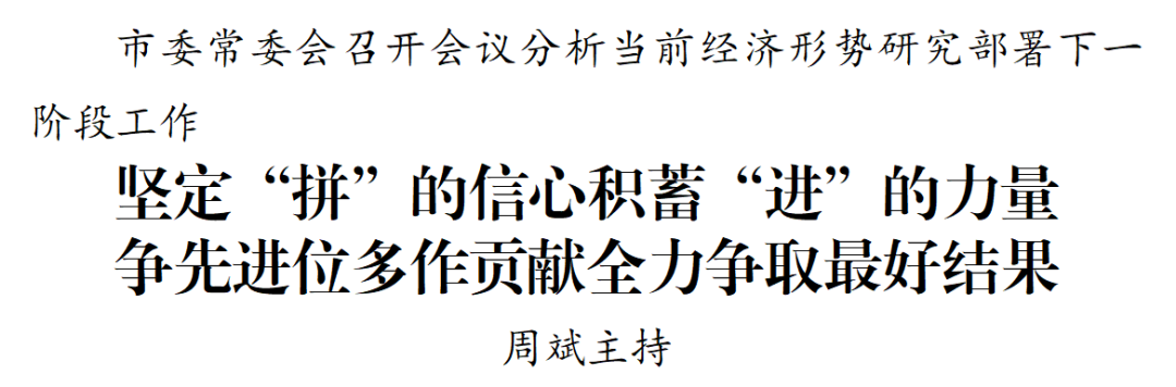 会议指出,当前,我市正处于经济恢复和产业升级的关键期。全市上下要科学研判形势,深入分析全省发展大势、周边发展态势、盐城发展趋势,在辩证分析中坚定“拼”的信心。要牢牢抓住发展机遇期和政策窗口期,以“坐不住”的紧迫感、“等不起”的危机感,加速破解瓶颈问题,推动重点地区、重点行业、重点项目再加力、再提速。