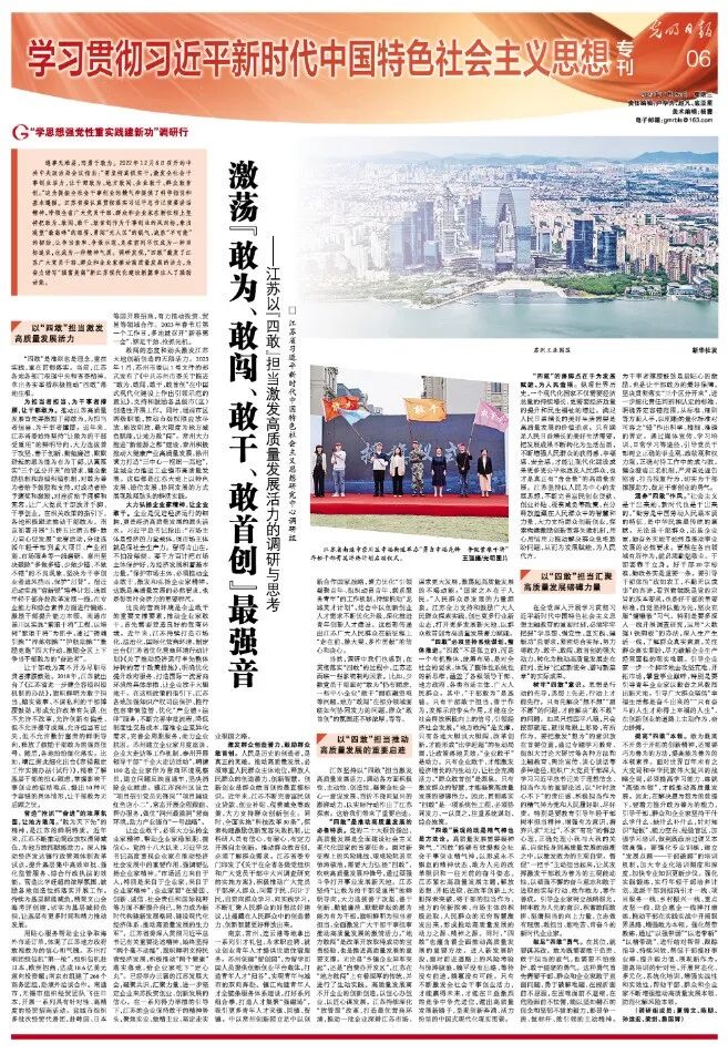 “四敢”展现的既是精气神也是方法论。高质量发展需要凝神聚气,“四敢”能够有效提振全社会干事创业精气神,以形成永不懈怠的精神状态、敢为人先的改革胆识和一往无前的奋斗姿态。江苏紧扣高质量发展主题,解放思想、开拓进取,在改革创新上大胆探索突破,将干部的担当作为、地方的创新探索、市场主体的积极进取、人民群众的无穷智慧激发出来,形成推动高质量发展的动力之源、精神之源。同时,“四敢”也蕴含着全面推动高质量发展的重要方法。进入新发展阶段,面对前进道路上的风险考验与惊涛骇浪,躺平没有出路,等待没有前途,躺赢没有可能。只有不断激发全社会干事创业活力,才能赢得未来,才能在日益激烈的竞争中争先进位,蹚出高质量发展新路子,呈现创新奔涌、活力纷呈的中国式现代化现实图景。