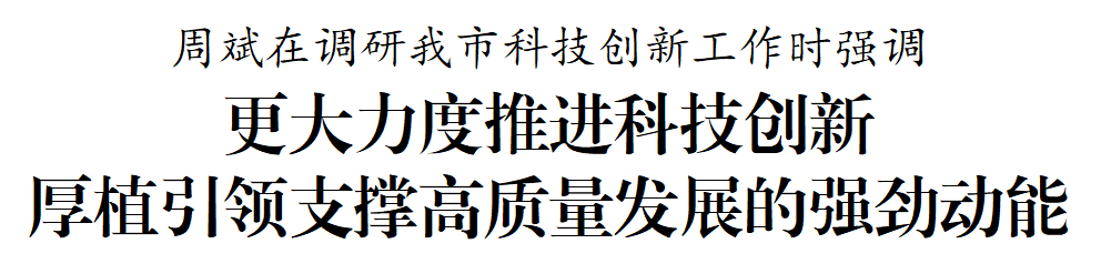 在调研中,周斌强调,中国式现代化关键在科技现代化。全市上下要认真学习贯彻习近平总书记关于科技创新的重要论述,坚定不移贯彻新发展理念,深入实施创新驱动发展战略,大力招引科创企业、高新项目,创新体制机制促进科创资源集聚整合,不断提高科技成果转化和产业化水平,打造高水平创新集群。要优化创新体系布局,强化基础研究,建设科创载体,优化资源配置,布局未来产业,强链补链延链,下好先手棋、抢占新赛道,不断提升创新能级。要优化科技创新生态,重视人才、关爱人才、服务人才,增强企业创新主体地位,集聚更多高水平人才团队,为全市高质量发展提供更强智力支撑。