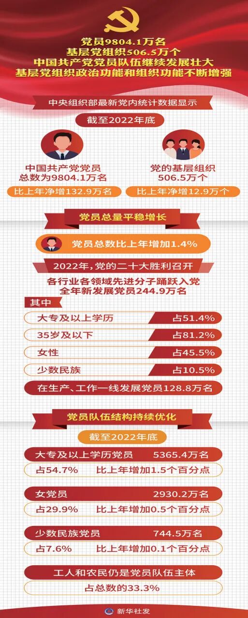 中央组织部最新党内统计数据显示,截至2022年底,中国共产党党员总数为9804.1万名,比上年净增132.9万名。党的基层组织506.5万个,比上年净增12.9万个。历经百年风雨和新时代10年革命性锻造,中国共产党更加坚强有力、更加充满活力,党的组织体系日益严密,党的执政根基不断巩固。新华社发