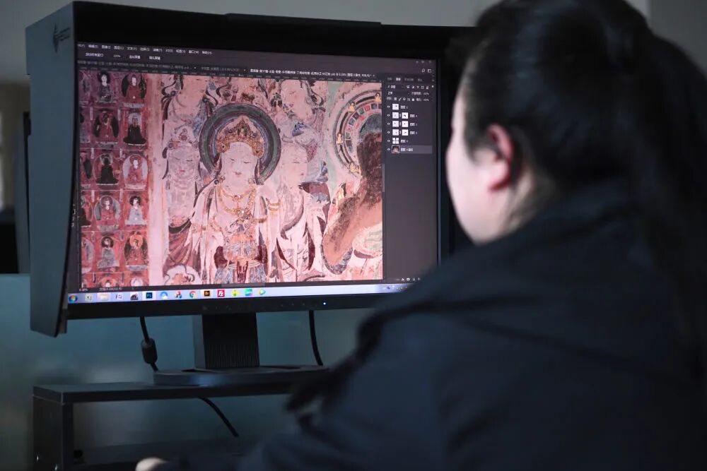 敦煌研究院文物数字化保护团队图像处理人员年海丽在拼接壁画图像(2023年4月25日摄)。数字化探索为莫高窟的保护与传承开辟了全新路径,数字技术让敦煌文物走出洞窟,跨出国门,走向“永久保存、永续利用”。