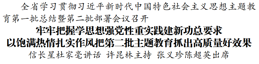 9月9日,全省学习贯彻习近平新时代中国特色社会主义思想主题教育第一批总结暨第二批部署会议召开。省委书记信长星、中央第六巡回指导组组长杜家毫出席会议并讲话。省长许昆林主持会议,省政协主席张义珍、中央第六巡回指导组副组长陈超英出席。