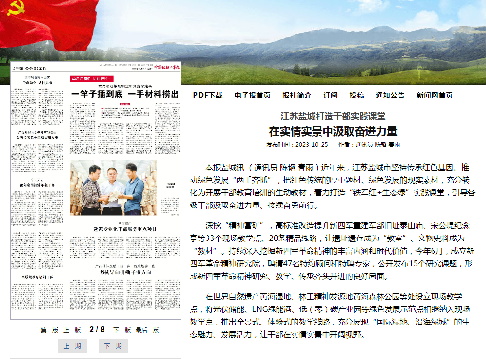 近年来,江苏盐城市坚持传承红色基因、推动绿色发展“两手齐抓”,把红色传统的厚重题材、绿色发展的现实素材,充分转化为开展干部教育培训的生动教材,着力打造“铁军红+生态绿”实践课堂,引导各级干部汲取奋进力量、接续奋勇前行。