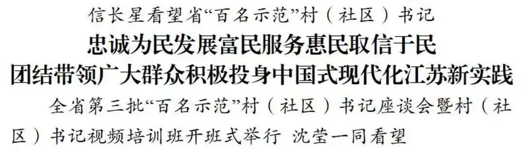12月6日,全省第三批“百名示范”村(社区)书记座谈会暨村(社区)书记视频培训班开班式举行。会前,省委书记信长星看望了第三批“百名示范”村(社区)书记,勉励大家深入学习贯彻习近平总书记对江苏工作重要讲话重要指示精神,牢记嘱托、感恩奋进、担当奉献,以扎扎实实、踏踏实实的行动,为推进中国式现代化江苏新实践作出新的更大贡献。省委副书记、省委组织部部长沈莹一同看望。