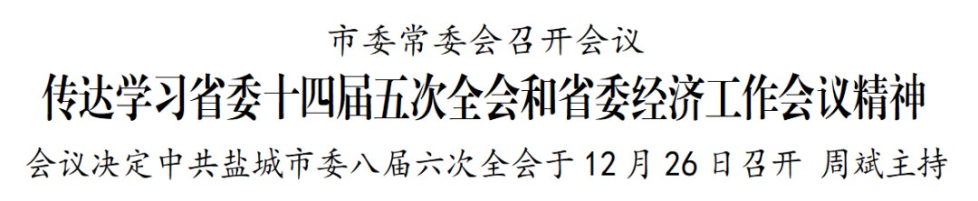 12月25日,市委常委会召开会议,深入学习贯彻省委十四届五次全会和省委经济工作会议精神,听取市委八届六次全会筹备工作情况汇报,研究新时代人大工作和年轻干部教育管理监督、黄河故道片区发展、社会稳定、安全生产等工作,审议《关于进一步激励广大干部在推动盐城高质量发展中担当作为、实干争先的实施细则》等文件。市委书记周斌主持并讲话。
