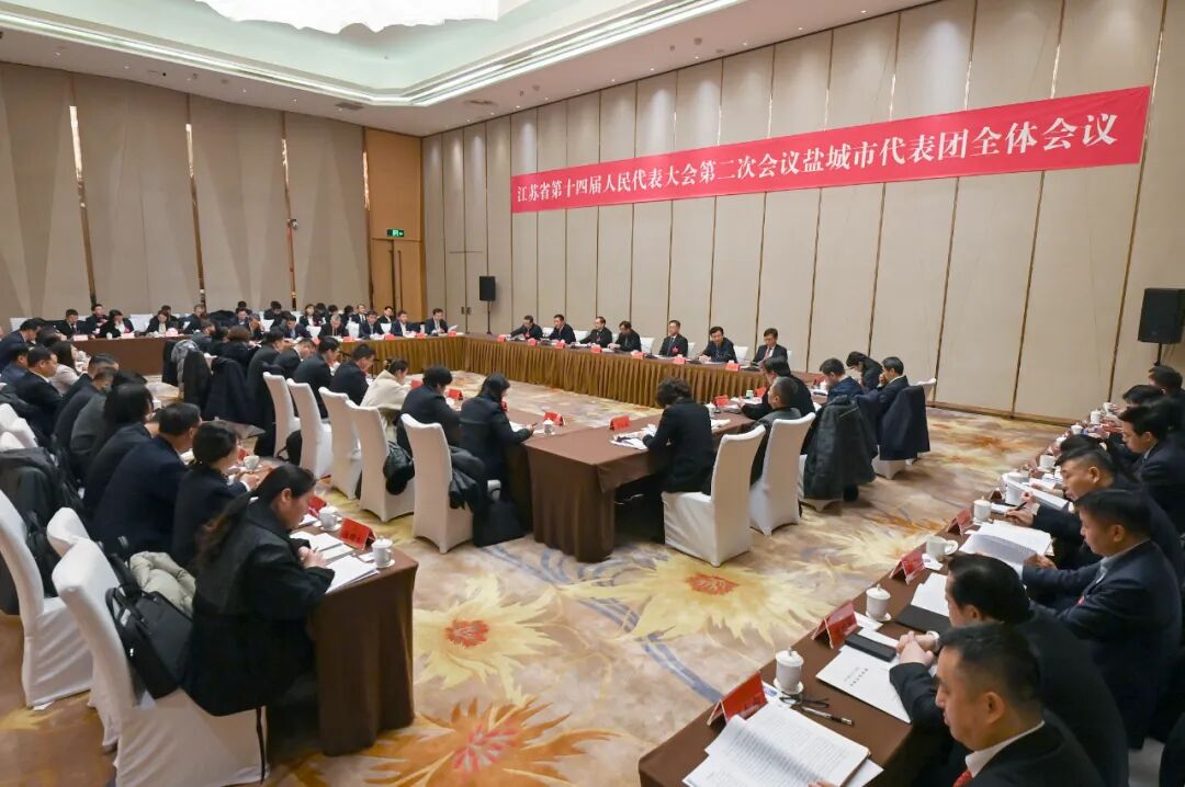 1月24日,盐城市代表团召开全体会议和代表小组会议,继续审议政府工作报告,审查计划报告、预算报告,审议《江苏省制定和批准地方性法规条例(修正草案)》《江苏省食品安全条例(草案)》,酝酿有关人选名单。代表们结合报告内容和各自实际踊跃发言,畅谈感想和体会,现场气氛十分热烈。盐城市代表团团长、市委书记周斌主持会议。市委副书记、市长张明康,市人大常委会主任王荣等参加。省人大教科文卫委主任委员陆永泉,省人大民宗侨外委主任委员李国华,省人大法制委员会副主任委员、省人大常委会法工委主任赵建阳,江苏省农垦集团党委书记、董事长吴本辉等省人大代表参加审议。