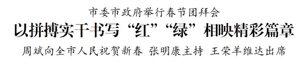 2月8日,市委市政府举行2024年春节团拜会。市委书记周斌、市长张明康、市人大常委会主任王荣、市政协主席羊维达等市四套班子领导,与全市各界人士欢聚一堂、辞旧迎新,向全市人民以及所有参与、关心和支持盐城经济社会发展的各界人士、海内外朋友,致以新春问候和美好祝福,祝伟大祖国繁荣昌盛、国泰民安,祝全市人民幸福安康、皆得所愿,祝盐城明天蒸蒸日上、更加美好。