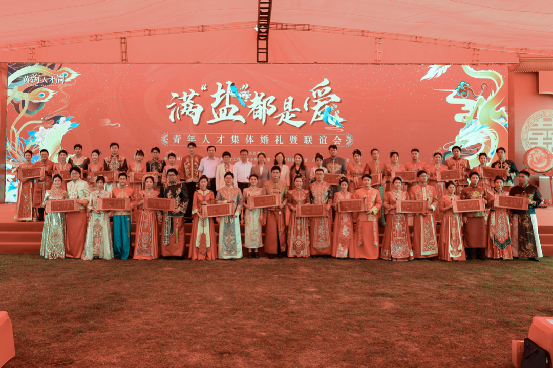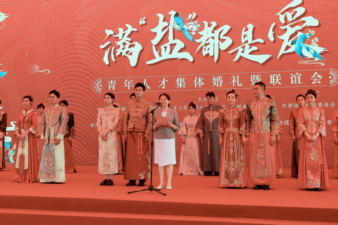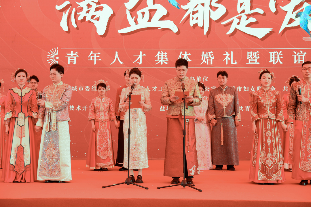 新人代表宣读倡议书,号召青年人才重视婚育、尊重生育,适龄婚育、优生优育,破除陋习、婚事新办,育儿责任、夫妻共担,弘扬美德、建设家风,用实际行动争做新时代婚育文化的倡导者、践行者、推动者。市委组织部、市妇联、团市委、盐城经济技术开发区有关负责同志出席活动。集体婚礼后,还开展了新型婚育观讲座和青年人才联谊交友活动。栽好梧桐树,凤凰自来栖。近年来,市委市政府聚焦青年人才源头活水,深入实施“黄海明珠人才计划”,近三年累计引进高校毕业生11.1万人,市县联动常态化开展青年人才联谊交友、集体婚礼等“乐在盐城”系列活动,一大批优秀青年人才在盐城邂逅了爱情,收获了爱情结晶,“潮奔黄海、才到盐城”人才品牌效应持续彰显。