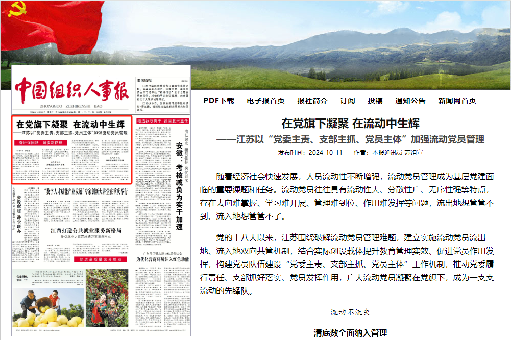 10月11日,《中国组织人事报》头版头条以《在党旗下凝聚 在流动中生辉》为题,报道我省以“党委主责、支部主抓、党员主体”加强流动党员管理有关情况。现将全文转载如下: