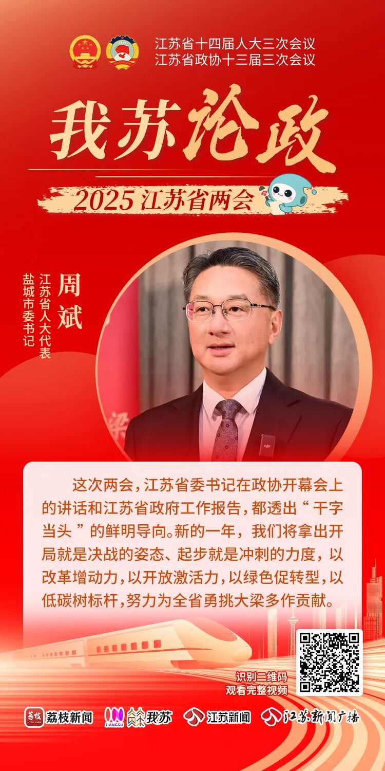 干字当头,勇挑大梁!2025年是“十四五”规划的收官之年。今年江苏省两会期间,江苏广电总台继续推出《我苏论政》时政品牌栏目,来听一听代表委员新一年的愿景期许与奋斗目标,看他们如何奋发有为,用实干担当奋力推进中国式现代化江苏新实践,展现他们的履职风采和江苏发展的蓬勃面貌。江苏省人大代表、盐城市委书记周斌接受采访。