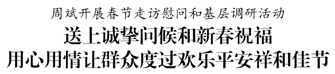 困难党员群众的生活,周斌始终记挂心头。在老党员陈如英家里,周斌细致了解老人身体状况、生活情况,祝福她新春快乐、身体健康,晚年更加幸福。困难户吴女士患有疾病,手术成功后在家休养。周斌鼓励她树立信心,保持乐观心态,相信未来充满希望,日子会越过越好。每到一处,周斌都叮嘱有关方面要更加关心关爱困难党员和群众的生活,及时提供帮助,注重精神关怀,真正把党委、政府的关怀温暖送到大家心坎上。