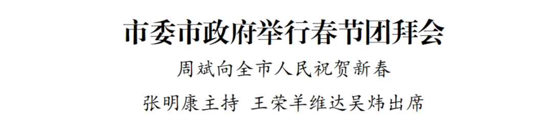 金龙腾飞送冬去,银蛇曼舞迎春来。1月26日下午,市委市政府举行2025年春节团拜会。市委书记周斌、市长张明康、市人大常委会主任王荣、市政协主席羊维达、市委副书记吴炜等市四套班子领导,与全市各界人士欢聚一堂、喜迎新春,向全市人民、各位老领导老同志,向所有关心支持盐城发展的社会各界人士、海内外朋友,致以新春问候和美好祝福。