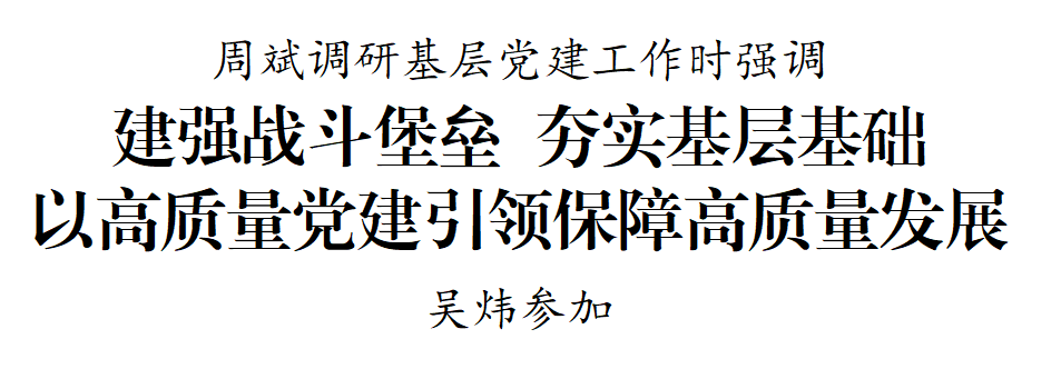 2月6日,市委书记周斌到盐都区、盐南高新区调研基层党建工作。他强调,要深入学习贯彻习近平总书记关于党的建设的重要思想和关于党的自我革命的重要思想,按照省委常委会专题听取抓基层党建工作述职时的点评要求,始终把抓好党建作为最大政绩,树立大抓基层的鲜明导向,坚持以“人”为核心,补短板、强弱项、解难题,推动基层党建工作走深走实、提质增效,以高质量党建引领保障高质量发展。市委副书记、市委统战部部长吴炜参加。
