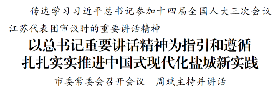 会上,有关同志围绕学习贯彻习近平总书记参加江苏代表团审议时的重要讲话精神进行了交流发言。会议指出,总书记的重要讲话,高屋建瓴、思想深邃,对江苏作为经济大省落实好挑大梁责任作了全面系统的论述,进一步明确了在挑大梁上要把握好的着力点,为我们做好工作提供了科学指引和根本遵循。要把学习好、宣传好、贯彻好习近平总书记重要讲话精神,作为当前和今后一个时期全市上下的重大政治任务,坚持把总书记在全国两会期间重要讲话精神同对江苏工作历次重要讲话重要指示精神一体学习贯彻、一体融会贯通,在提高站位、找准定位、争先进位中,扎扎实实推进中国式现代化盐城新实践,以一域发展为全省勇挑大梁多作贡献。