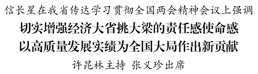信长星指出,这次全国两会是在“十四五”规划收官之年召开的一次重要会议。习近平总书记再次亲临江苏代表团参加审议并发表重要讲话,饱含着对江苏发展的关心关怀和殷切期望,为做好江苏工作提供了科学指引和根本遵循。深入学习宣传贯彻全国两会精神,特别是总书记参加江苏代表团审议时的重要讲话精神,是当前和今后一个时期全省上下的重大政治任务。要从过去一年取得的发展新成就中深刻领悟“两个确立”的决定性意义,深刻认识到,过去一年,面对复杂严峻形势,正是以习近平同志为核心的党中央沉着应变、综合施策,正是因为总书记在关键时刻、重要节点果断部署一揽子增量政策,才一举扭转局势,推动经济运行迅速后扬;正是因为总书记为我们在因地制宜发展新质生产力上作出重要指示、指明方向路径,正是因为党中央更大力度支持经济大省挑大梁,正是因为全省上下坚决贯彻总书记对江苏工作重要讲话精神,江苏才有效应对克服各种困难和挑战,实现了经济持续回升向好,我们要始终紧跟总书记、奋进新征程,以实际行动做到“两个维护”。要从总书记赋予江苏的重大责任中强化使命担当,深刻认识到,经济大省要挑大梁,是总书记和党中央对包括江苏在内的经济大省提出的明确要求。江苏作为第二经济大省,落实好挑大梁的责任责无旁贷,这本身就是推动高质量发展的内在要求和“走在前、做示范”的具体体现。要从总书记强调的“四个着力点”中把准实践路径,认真落实“在推动科技创新和产业创新融合上打头阵”的重要指示,坚持教育、科技、人才一起抓,坚持推动传统产业改造升级和开辟战略性新兴产业、未来产业新赛道并重,着力打通制约创新链和产业链对接的堵点卡点,加快建设“一中心”“一基地”,加快打造发展新质生产力的重要阵地;认真落实“在推进深层次改革和高水平开放上勇争先”的重要指示,聚焦重点领域和关键环节改革,破立并举、先立后破,以制度供给增创先发优势,大力拓展国际合作空间,加快建设“一枢纽”,构筑起高水平开放的新优势;认真落实“在落实国家重大发展战略上走在前”的重要指示,更加注重协同联动、战略对接,深化跨区域合作,抓好统筹发展和安全各项工作,增强江苏发展的辐射带动力;认真落实“在促进全体人民共同富裕上作示范”的重要指示,在推进城乡融合发展、办好民生实事、提升基本公共服务水平、抓好就业这个最基本民生、精神文明建设等方面取得更大进展。要坚持党的全面领导,以高质量党建引领高质量发展,在营造干事创业良好氛围和风清气正政治生态上拿出更多举措,从领导干部做起,带动广大党员干部以求真务实、真抓实干的作风和遵规守纪、清正廉洁的形象,勇挑重担、开拓进取,奋力谱写“强富美高”新江苏现代化建设新篇章。信长星指出,这次全国两会深入贯彻习近平总书记重要讲话重要指示精神和党中央决策部署,主动回应群众期盼和社会关切,对今年各项工作作了科学安排。我们要全面学习领会,以钉钉子精神推动各项任务落地落实。要深入践行全过程人民民主,持续扩大人民有序政治参与,全面发展协商民主,巩固发展最广泛的爱国统一战线,为推进中国式现代化江苏新实践凝聚人心、凝聚智慧、凝聚共识、凝聚力量。信长星强调,要以学习贯彻习近平总书记重要讲话和全国两会精神为强大动力,紧抓当前、抓好当前。认真贯彻党中央决策部署,强化政策衔接配套,加强经济运行监测分析调度,及时发现和解决苗头性、趋势性问题,继续巩固和增强经济回升向好态势。坚持底线思维,以“时时放心不下”的责任感,切实防范化解各领域风险隐患。认真开展深入贯彻中央八项规定精神学习教育,聚焦主题,注重实效,一体推进学查改,确保学有质量、查有力度、改有成效,推动全省广大党员干部以更强担当、更优作风、更好形象落实好经济大省挑大梁责任。会议以视频会议形式召开。我市组织收听收看。