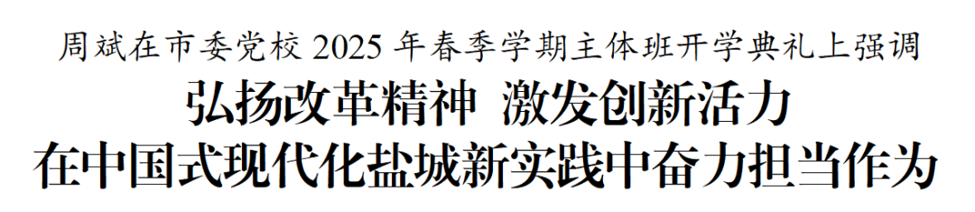 3月17日,市委党校2025年春季学期主体班开学典礼举行。市委书记周斌为学员讲授第一课,宣讲全国两会精神,对学习培训提要求。他强调,要深入学习贯彻习近平总书记参加江苏代表团审议时的重要讲话精神,自觉对标对表“打头阵、勇争先、走在前、作示范”重大要求,大力弘扬改革精神,全面激发创新活力,以勇挑重担开拓进取的作风形象积极履职,为扎实推进中国式现代化盐城新实践贡献力量。