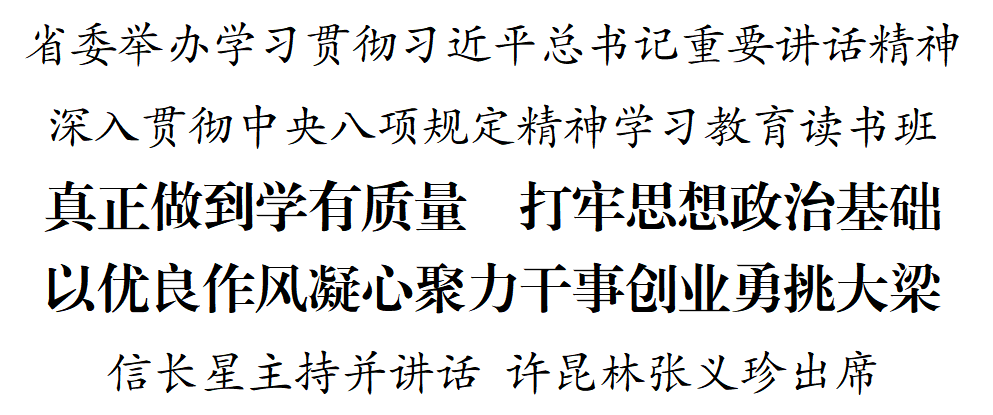 3月31日至4月2日,省委举办学习贯彻习近平总书记重要讲话精神、深入贯彻中央八项规定精神学习教育读书班。省委书记信长星在开班式上讲话并主持集中交流。他强调,要通过原原本本学习领会习近平总书记参加今年全国人代会江苏代表团审议时的重要讲话精神和总书记关于加强党的作风建设的重要论述,进一步深化对挑大梁重大责任以及“四个着力点”的理解和把握,进一步吃透中央八项规定及其实施细则精神,把握相关纪律处分条规,真正做到学有质量,打牢思想政治基础,更好地以优良作风凝心聚力、干事创业,扛好经济大省挑大梁责任。省委副书记、省长许昆林,省政协主席张义珍出席。