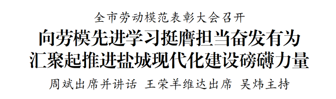 5月26日,市委、市政府召开全市劳动模范表彰大会,深入学习贯彻习近平总书记在庆祝中华全国总工会成立100周年暨全国劳动模范和先进工作者表彰大会上的重要讲话精神,表彰为盐城高质量发展作出突出贡献的劳动模范,进一步动员激励全市广大干部群众弘扬劳模精神、劳动精神、工匠精神,为奋力推进中国式现代化盐城新实践作出新的更大贡献。市委书记周斌出席并讲话。市人大常委会主任王荣、市政协主席羊维达出席。市委副书记吴炜主持。