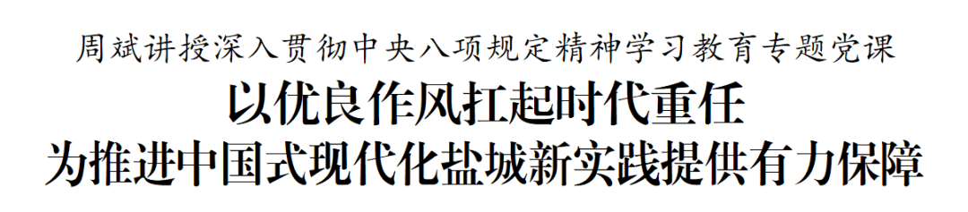 7月1日是中国共产党成立104周年纪念日,市委书记周斌为新提拔干部、年轻干部、关键岗位干部讲授深入贯彻中央八项规定精神学习教育专题党课。他强调,要深入学习领会习近平总书记关于加强党的作风建设的重要论述,锲而不舍贯彻中央八项规定及其实施细则精神,以优良作风扛起时代重任,为推进中国式现代化盐城新实践提供有力保障。