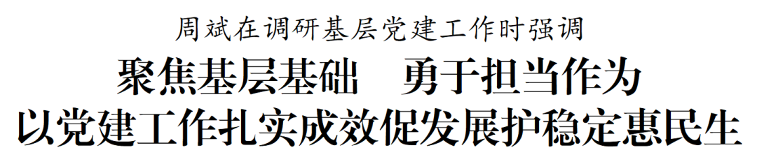 近日,市委书记周斌到亭湖区调研基层党建工作。他强调,要深入学习贯彻习近平总书记关于党的建设的重要思想,牢固树立大抓基层的鲜明导向,深化改革创新意识,勇于实干担当作为,不断增强党组织政治功能和组织功能,以党建工作的扎实成效促发展、护稳定、惠民生,为盐城现代化建设提供有力支撑。
