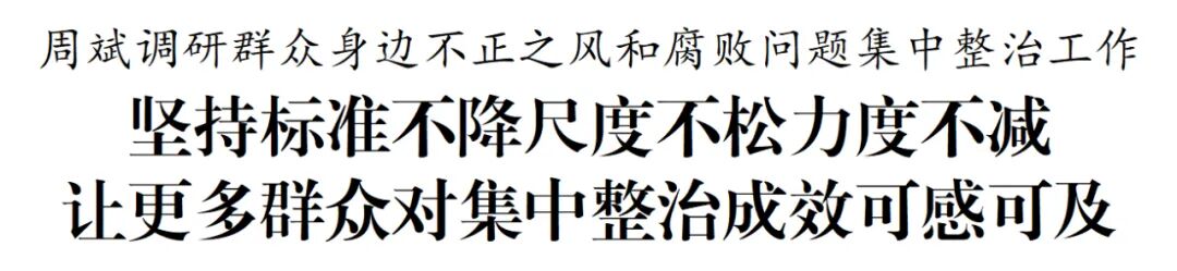 近日,市委书记周斌调研群众身边不正之风和腐败问题集中整治工作。他强调,要深入学习贯彻习近平总书记关于党的自我革命的重要思想,认真落实党中央决策部署和省委最新要求,坚持问题导向,压紧压实责任,注重标本兼治,让更多群众对集中整治成效可感可及。