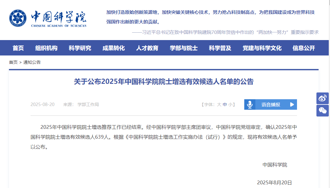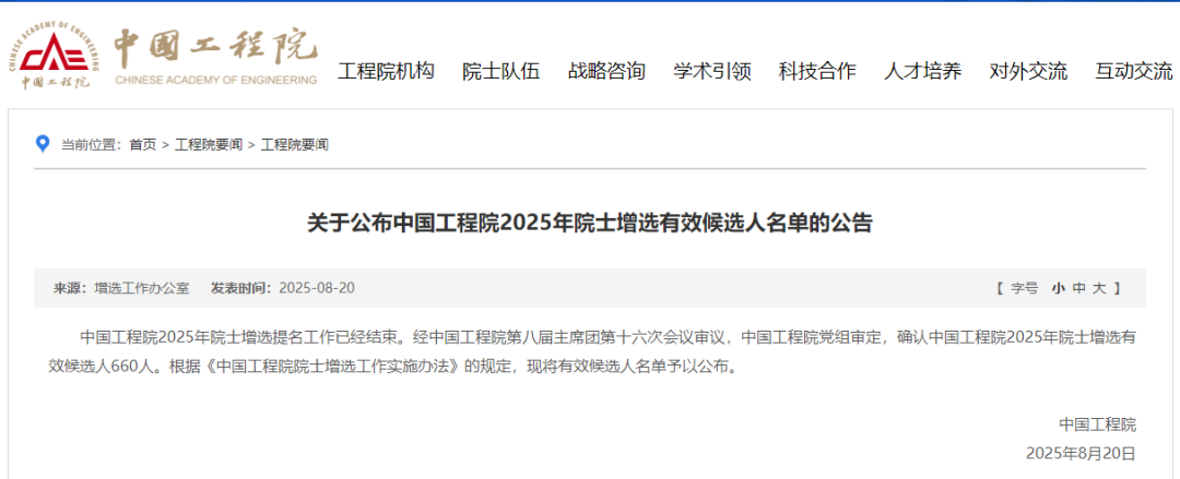 中国科学院、中国工程院8月20日公布2025年院士增选有效候选人名单,中国科学院院士增选有效候选人639人,中国工程院院士增选有效候选人660人。