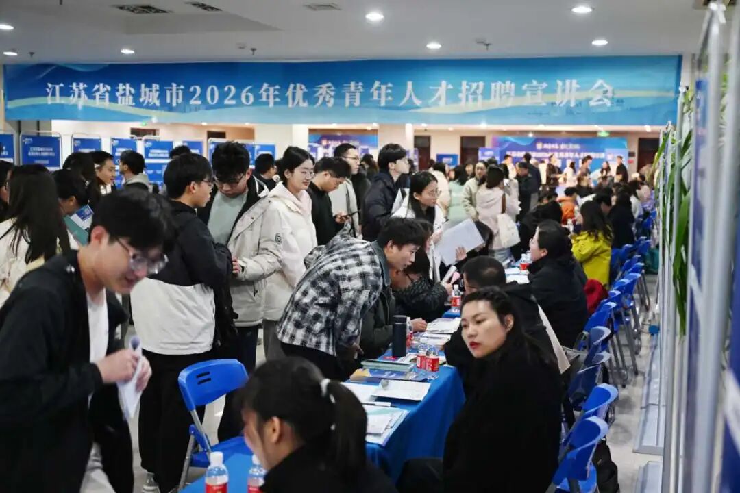 黄海之滨的风,吹来了千年盐渎的邀约;崂山脚下的海,激荡着青春不息的浪花。宣讲会现场气氛热烈,不仅吸引了中国海洋大学2026届的学子,也引来了山东大学等多所高校的毕业生。同学们对盐城的区位、政策和发展前景表现出浓厚兴趣,或仔细聆听宣讲,或认真咨询岗位,慎重地投递出一份份满载期待的简历。