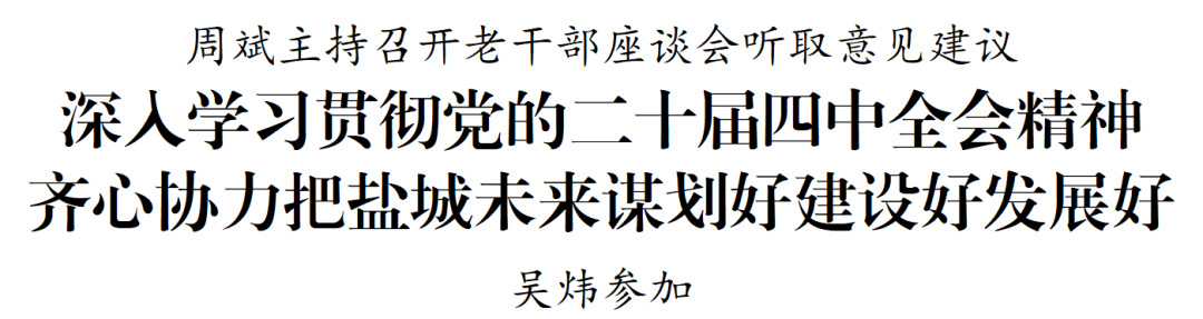11月5日,市委书记周斌主持召开老干部座谈会,深入学习贯彻党的二十届四中全会精神,就推动我市“十五五”时期发展听取意见建议,共同把盐城未来谋划好、建设好、发展好。市委副书记吴炜参加。