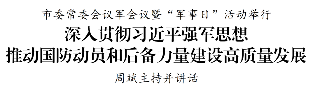 11月26日,市委常委会议军会议暨“军事日”活动举行,深入学习习近平强军思想和党的二十届四中全会精神,贯彻落实党管武装原则和党中央决策部署,对推动我市国防动员和后备力量建设高质量发展工作作出部署。市委书记、盐城军分区党委第一书记周斌主持会议并讲话,代表市委、市政府,向军分区和驻盐部队全体官兵,向全市广大民兵预备役人员、退役军人表示衷心感谢和崇高敬意。